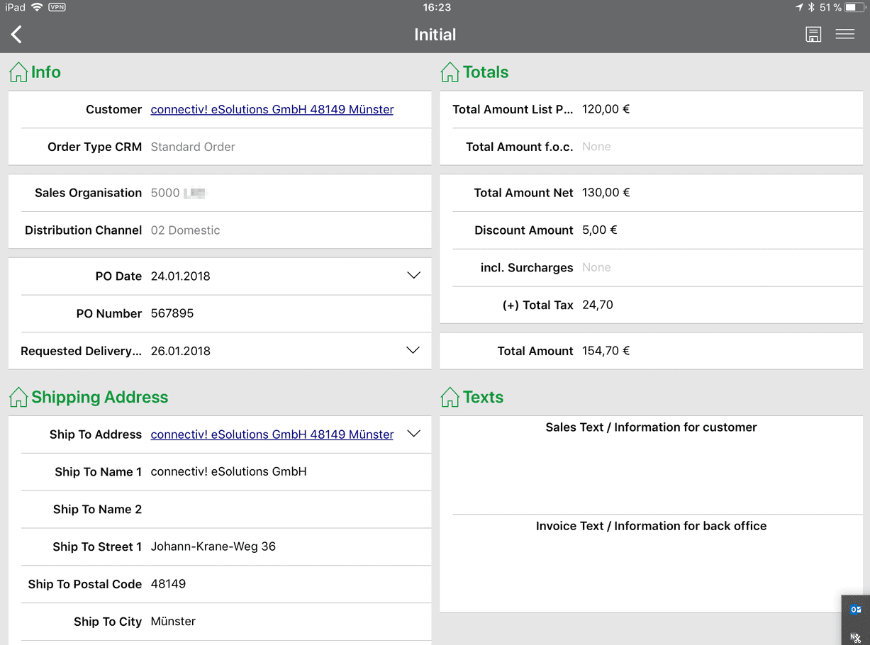 The solution developed by connectiv! is built on top of Resco’s technology (JS Bridge) and enables seamless order entry directly on site. Resco’s Mobile App has been expanded, to map the entire ordering process on the go – no interruption within the sales process due to the seamless integration between CRM (Dynamics 365) and ERP (SAP) system.